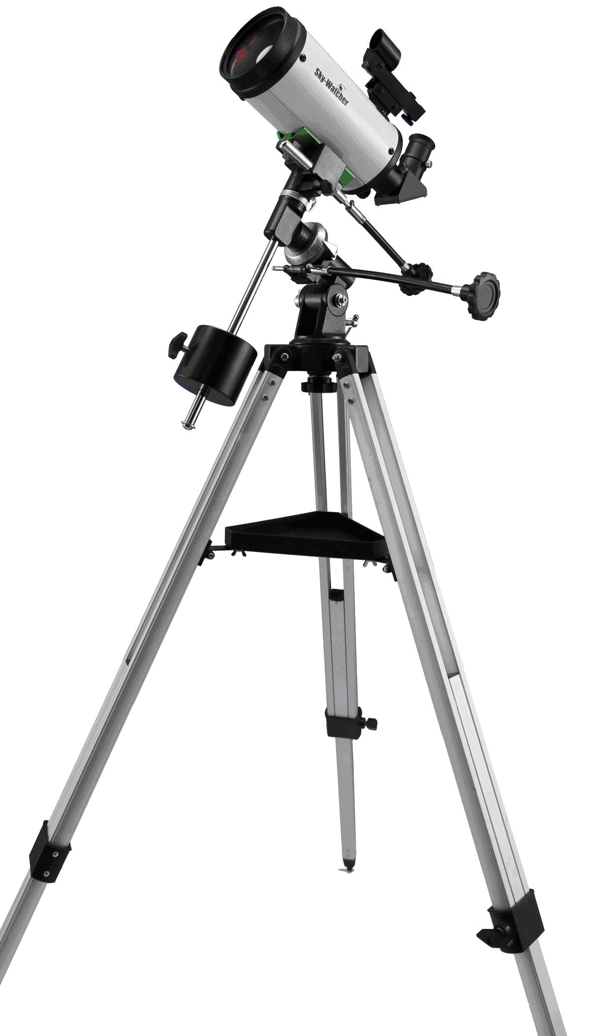 90/1250 SkyWatcher Skymax-90 cu tub alb Maksutov-Cassegrain pe mecanism EQ1. Echipament: Starpointer, oglindă zenith, oculare Photo20 (62,5x) și Photo10 (125x)