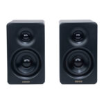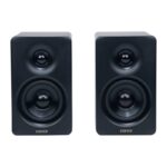 Pe lângă performanțele lor, boxele Edifier M60 impresionează și prin designul elegant și minimalist. Cu dimensiuni compacte (100 × 168 × 147 mm) și suporturi din aluminiu incluse, boxele se integrează perfect în orice interior. Suporturile, proiectate cu un unghi de înclinare de 15 grade, direcționează sunetul direct către urechile utilizatorului, reducând în același timp reflexiile de pe suprafața biroului.