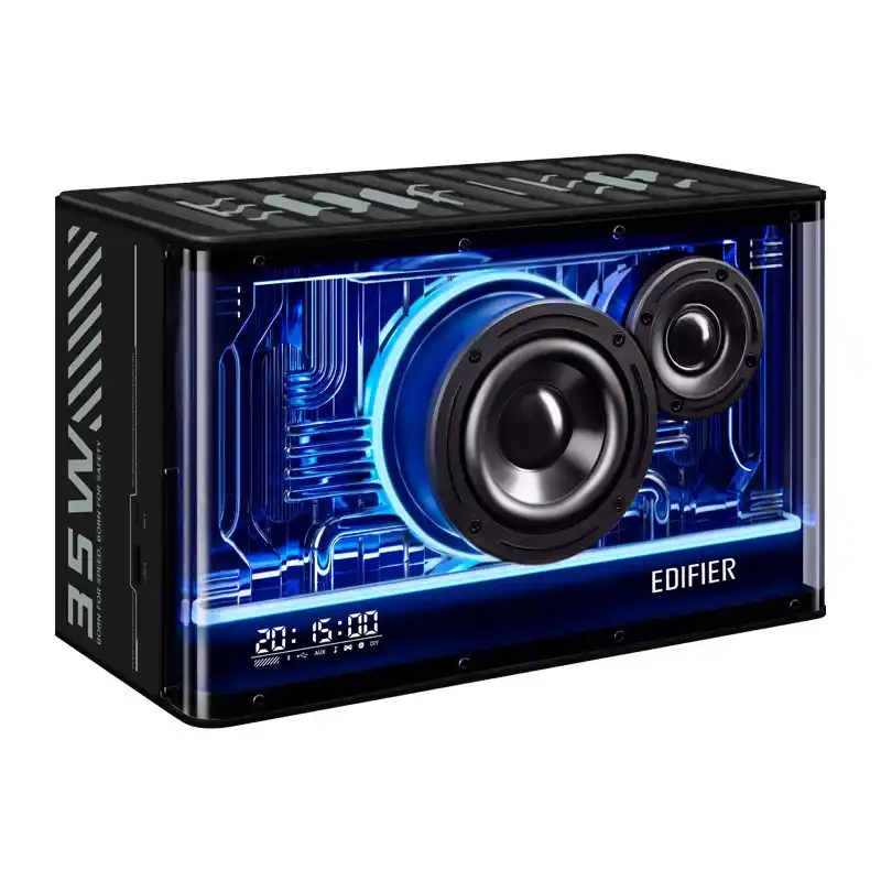 Experimentează calitatea audio excepțională cu Edifier QD35, o boxă certificată Hi-Res Audio, ce oferă suport pentru codec-ul LDAC. Echipată cu două porturi de încărcare pentru smartphone sau tabletă, boxa poate fi conectată prin cablu sau wireless, datorită Bluetooth 5.3. Designul transparent cu iluminare colorată adaugă o notă spectaculoasă și modernă acestui dispozitiv audio.