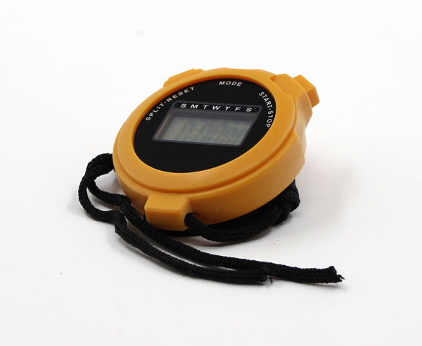 With start and stop function, intermediate times, alarm function and hourly beep.