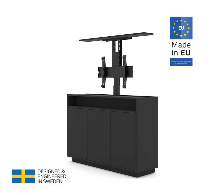 Combinată cu o bară video și cu computerul dumneavoastră, această soluție, împreună cu Teams, Skype, Zoom sau alte programe de comunicații video, vă oferă acum o stație mobilă pentru sala de ședințe. Aceasta este o soluție completă de ridicare a televizorului pop-up pentru aproape orice situație, creând ușurință în utilizare.