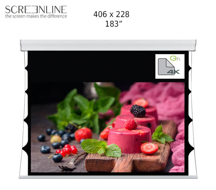 Proiecție frontală – câștig 0,8 – 380 microni – H roll 2200 mm pentru ecran motorizat H roll 3200 mm pentru ecran cu ramă – Omologat 4K