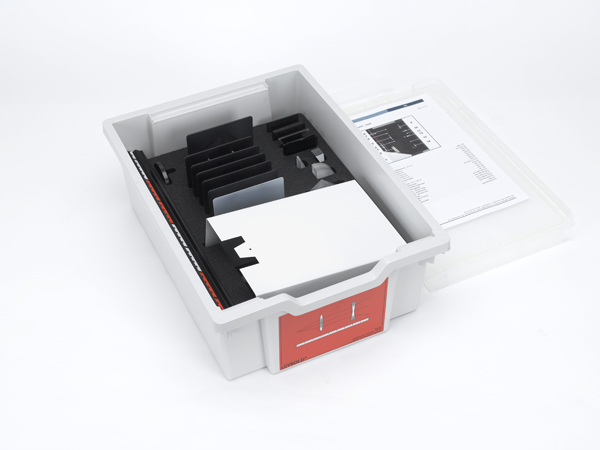 Set de echipamente pentru realizarea experimentelor de bază în optică, cum ar fi refracția, reflexia totală, proiectorul, descompunerea luminii albe. În cutie de depozitare cu inserție din spumă, cu locașuri special modelate pentru aparate și capac.
