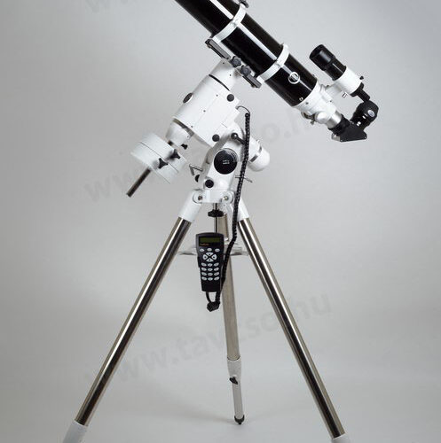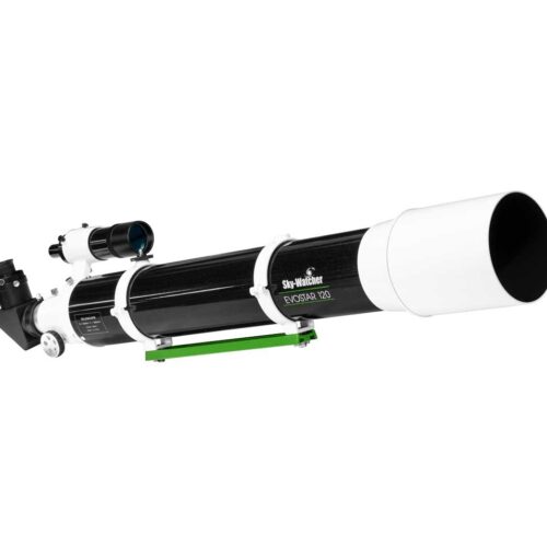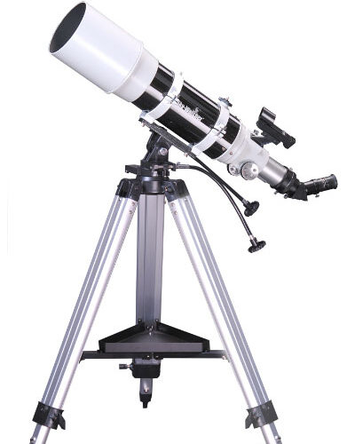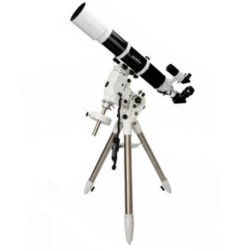 Tub refractor SkyWatcher Evostar-120 120/1000. Echipament: lunetă căutătoare 9×50, oglindă zenitală de 2″, oculare cu bariu de 25 mm (40x) și 10 mm (100x)
