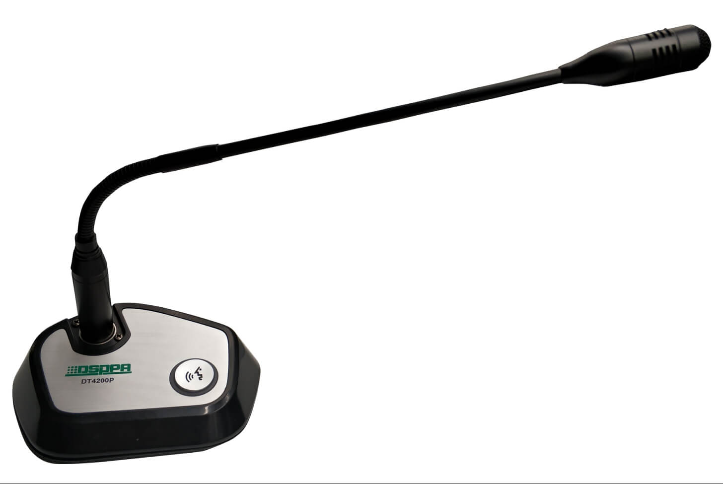 DT4200P este un microfon de birou cu funcție Dante, care este potrivit pentru instalarea rapidă a oricărui microfon cu gât de gâscă XLRM cu cap de tun. Suportul microfonului are un comutator cu atingere ușoară, iar indicatorul LED roșu arată starea microfonului. Designul microfonului este elegant, ergonomic și modern. Partea inferioară este echipată cu tampoane de amortizare din spumă de silicon, care pot reduce zgomotul generat de vibrațiile de la birou. Culoarea discretă și învelișul negru mat pot spori gradul de disimulare în situații serioase. Suportul de microfon este proiectat pentru a fi fixat pe o suprafață plană, asigurând înregistrări audio de înaltă calitate și profesionale, emisiuni TV, întâlniri de dimensiuni mici și medii și predare la distanță.