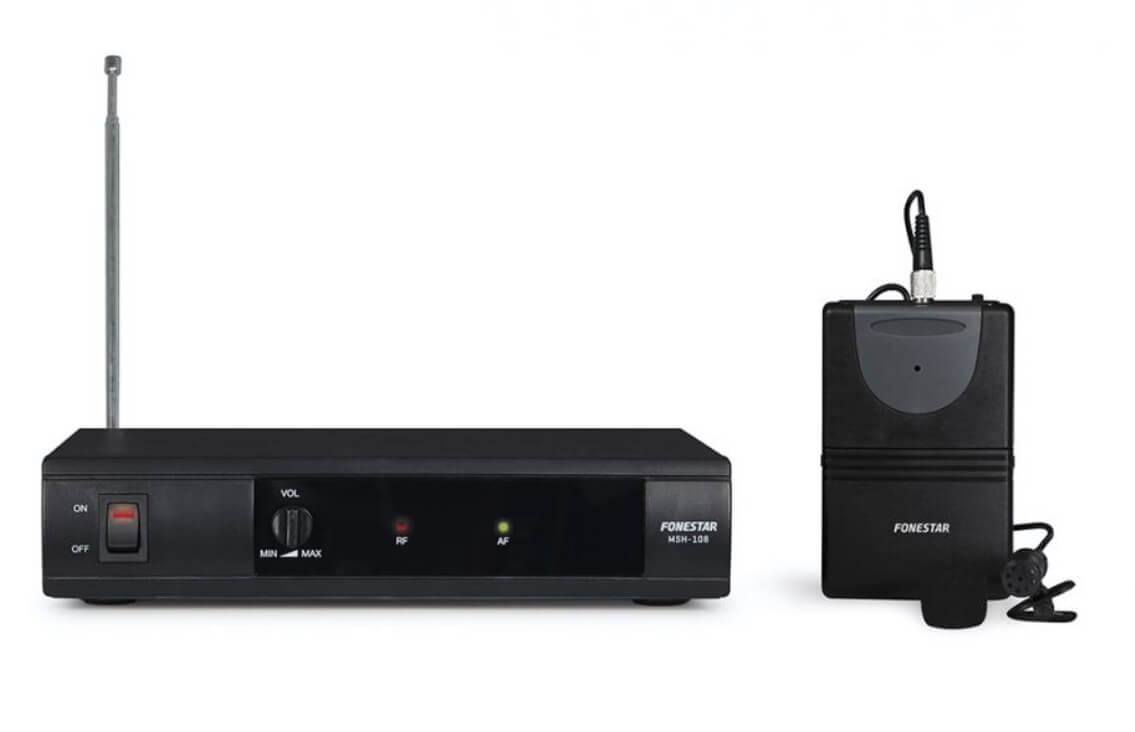 Receptor compact VHF 174 până la 194 MHz. Control de frecvență fix la cuarț. Control de volum. Ieșire neechilibrată. Microfon cu clemă de cravată cu capsulă condensatoare electret unidirecțională și transmițător wireless pentru centură.RECEPTOR/MICROFON