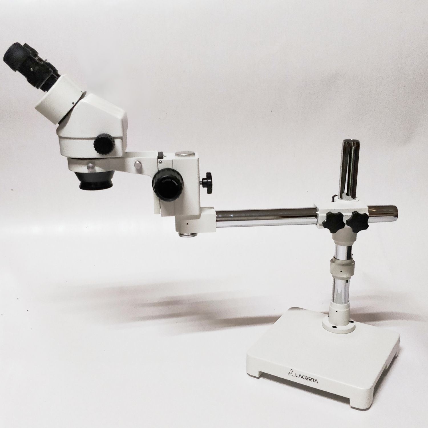 Microscop stereo trinocular STM45t-pro cu zoom profesional (0,67-4,5x) pe stativ industrial, mărire 7-45x