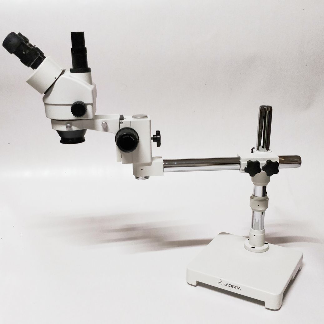 Microscop stereo cu zoom Lacerta IPOS-808 (sistem optic paralel Infinity) cu obiectiv cu zoom plan de 0,8x-6,4x (interval de mărire 8x-64x) și fără fototub