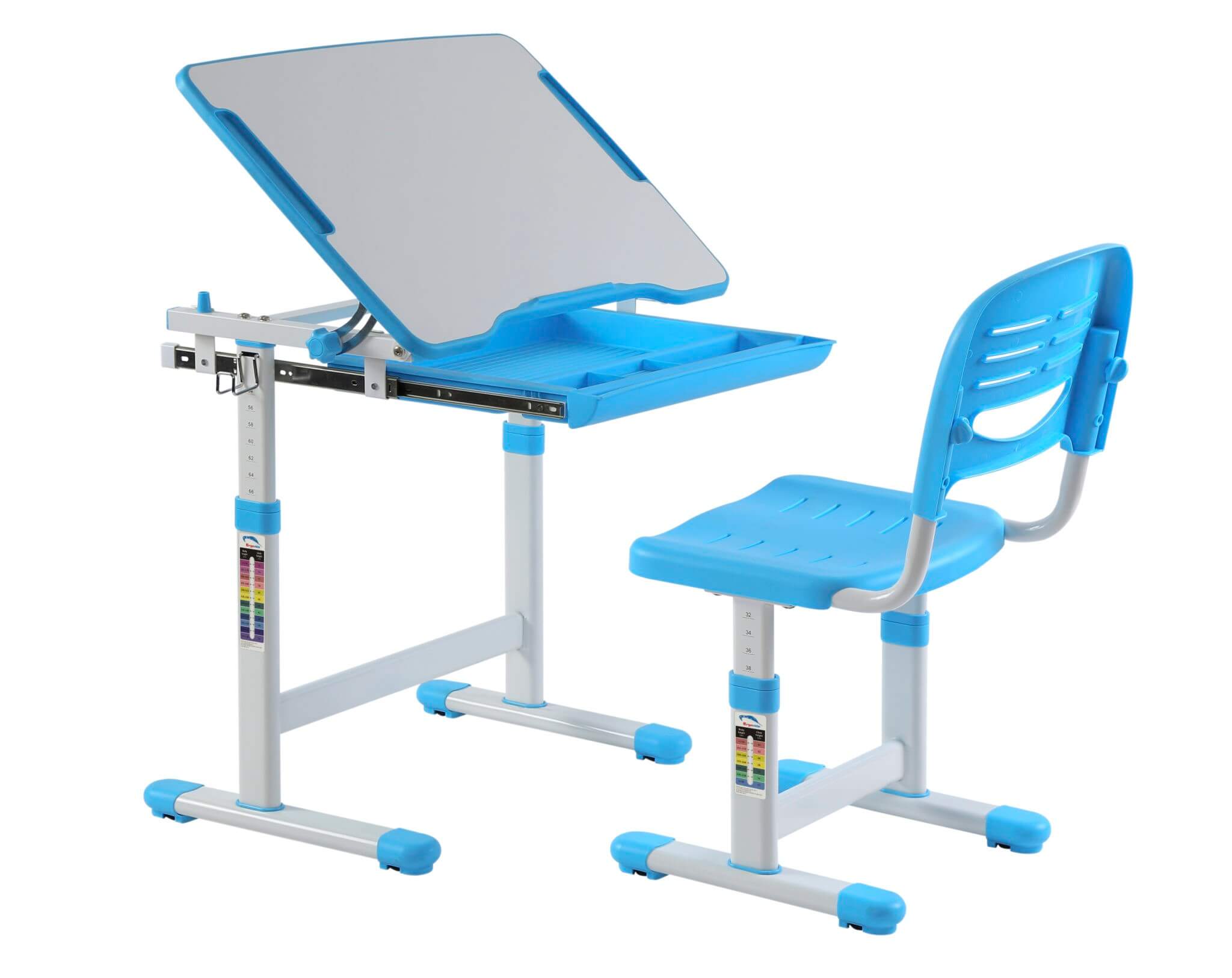 Biroul ergonomic B201 poate fi inclinat intr-un unghi optim de pana la 40 de grade pentru a proteja coloana vertebrala, umarul, gatul si vederea copilului in timp ce invata, citeste sau deseneaza. Sistemul de inchidere a blatului este prevazut cu picioruse de protectie pentru a evita prinderea manutelor copilului Dumneavoastra.