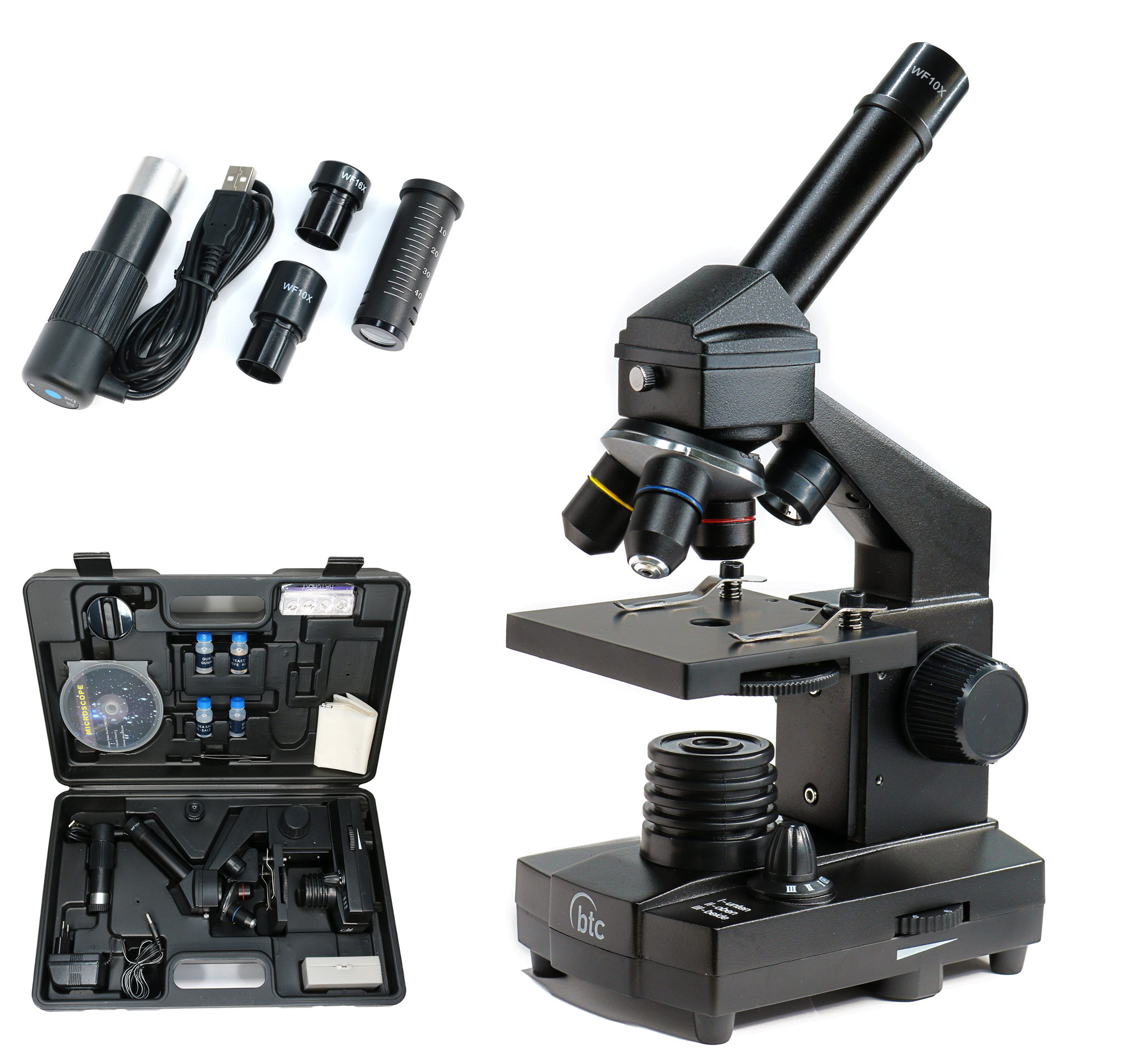 Setul include o cameră auxiliară, ideală pentru observarea pe ecran sau documentare, precum și un pachet generos de accesorii: preparate permanente, lame pentru pregătirea probelor, reactivi, microtom pentru secționare fină, cutie de depozitare și geantă de transport, care asigură organizarea și protecția întregului echipament.