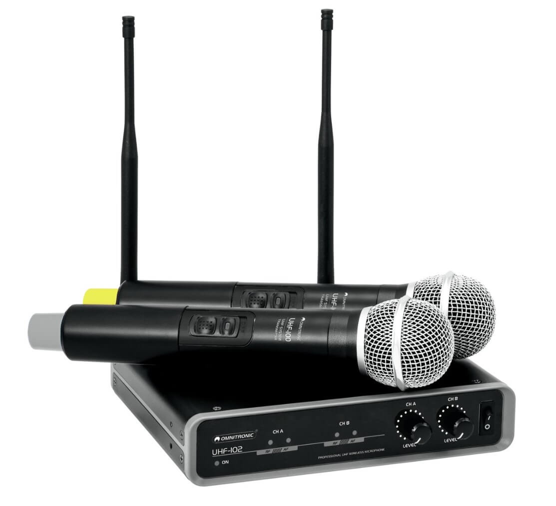 - Unități de recepție cu 2 canale și 2 microfoane de mână cu tehnologie UHF PLL
