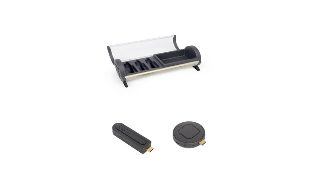 Simplificați încărcarea transmițătoarelor HDMI QuickCast plasându-le în suportul de încărcare convenabil. Suportul de încărcare poate găzdui până la trei transmițătoare QuickCast și poate încărca fiecare transmițător în aproximativ 2,5 ore. Suportul dispune, de asemenea, de o tavă de depozitare pentru orice adaptoare sau cabluri care pot fi necesare.
