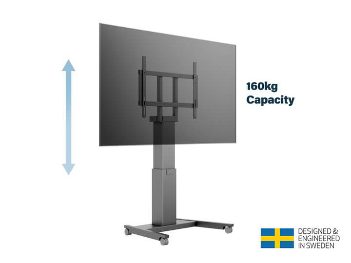 Stand-ul monitorizat de podea este un stand elegant, robust si stabil ce ofera o sustinere sigura pentru ecranele de dimensiuni mari. Utilizand performanta heavy duty si un motor extrem de puternic, stand-ul este capabil sa ridice pana la 160 kg cu o miscare stabila. Fiind capabil sa ajusteze inaltimea ecranului la o apasare de buton, poti intotdeauna sa fi in conformitate cu audienta ta, fie ca aceasta sta in picioare sau este asezata. Baza unica si extrem de rezistenta este construinta in asa fel incat sa poata sustina ecranele in deplina stabilitate chiar si atunci cand baza este pe roti.