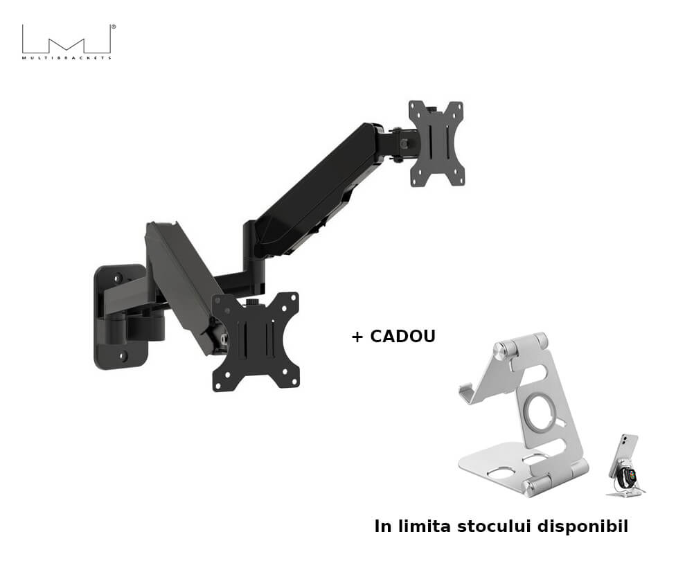 O soluție bine concepută de spațiu de lucru de înaltă eficiență. Multibrackets Monitormount Wall Basic Dual își propune să elibereze spațiul ocupat pe birou printr-un design unic care oferă o manevrabilitate mai ușoară și capabil să se miște chiar și pentru a se potrivi la nivel de un perete. Perfect pentru ecrane cu dimensiuni cuprinse între 17" și 32", acest braț pentru monitor oferă ajustări pe înălțime și unghiul ecranului pentru vizualizare optimă și poziție ergonomică. Cu o capacitate de greutate maximă de 8 kg per ecran, poate fi montat cu ușurință pe majoritatea suprafețelor de birou, cu un design de fixare care reduce timpul de instalare