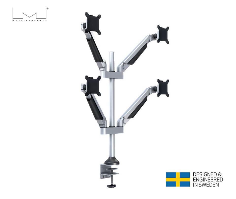 Brațul de monitorizare Quad cu trei articulații suspendate cu gaz a fost proiectat de Multibrackets pentru a optimiza productivitatea și pentru a ajuta la reducerea efortului asupra gâtului, spatelui și ochilor.