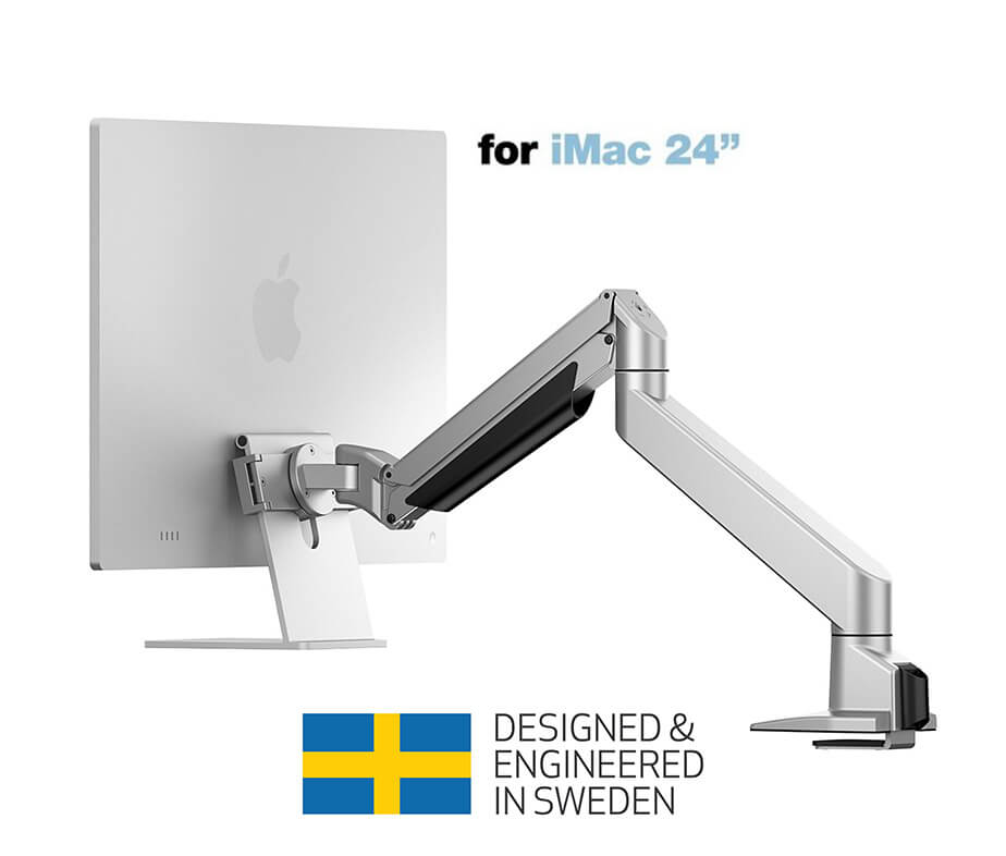 Un braț de monitor cu trei articulații, suspendat pe gaz, proiectat de Multibrackets pentru iMac 24” pentru a vă optimiza productivitatea și pentru a ajuta la reducerea tensiunii de pe gât, spate și ochi.