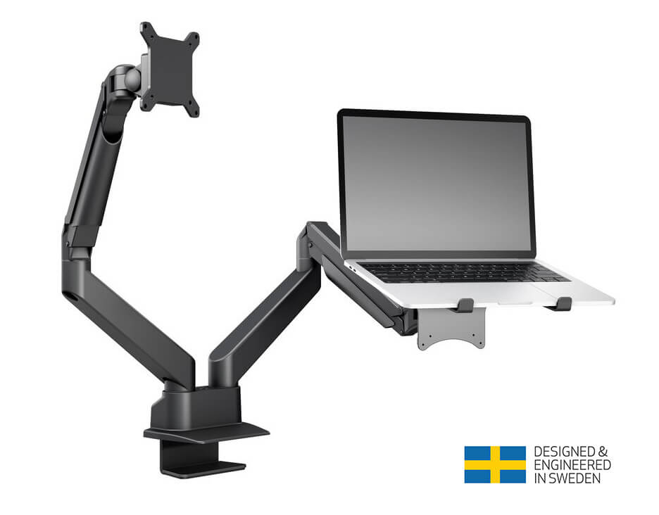 Suport monitor si laptop format din Suport 2 monitoare Gas Spring Dual Arm Blackmount MNT16-2 si Adaptor Laptop BM-NBH-6