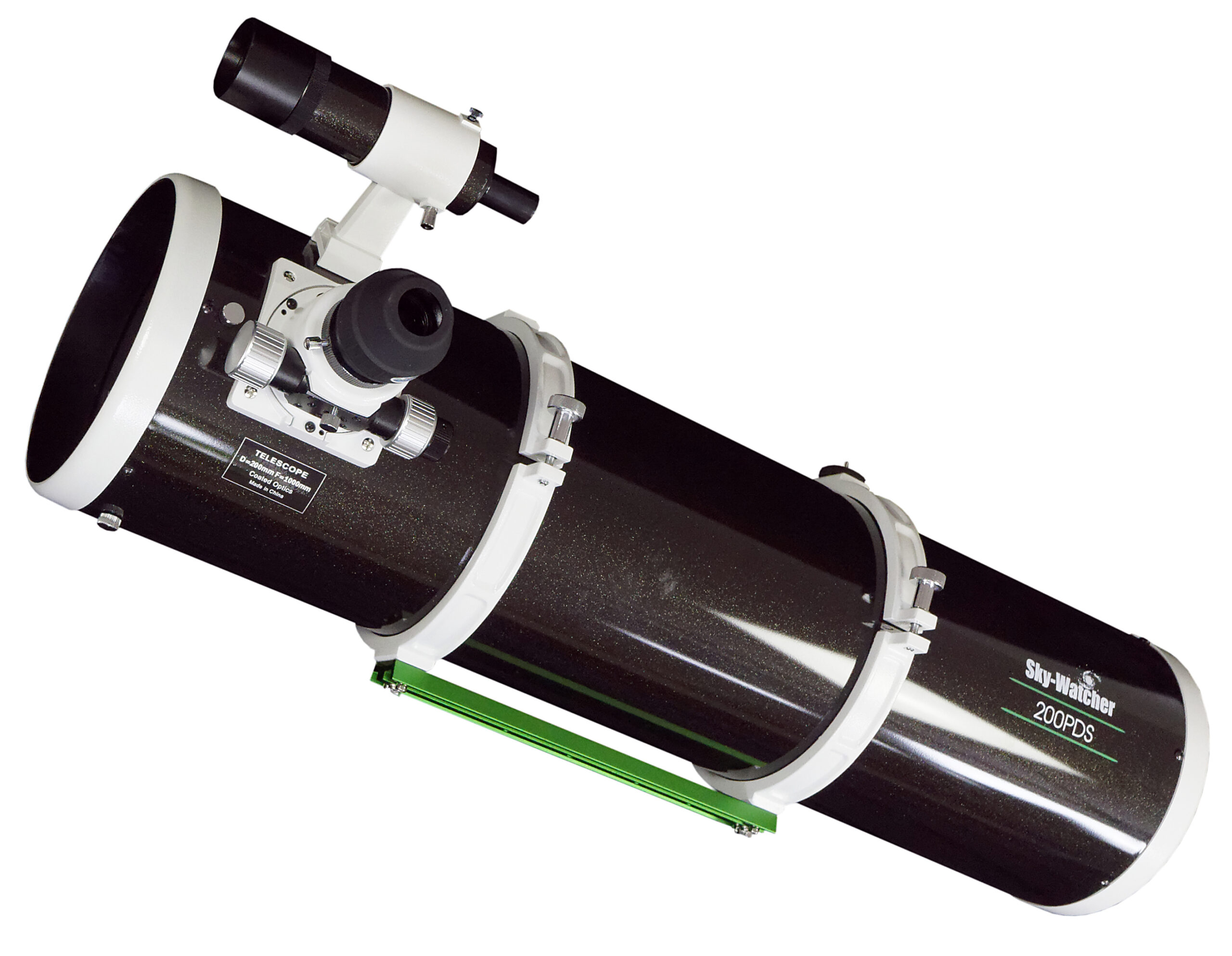 Tub newtonian SkyWatcher Explorer-200PDS 200/1000 cu focalizator Crayford cu două viteze (1:10). Echipament: lunetă căutătoare 9×50, pereche de inele tubulare, ocular APEX de 28 mm