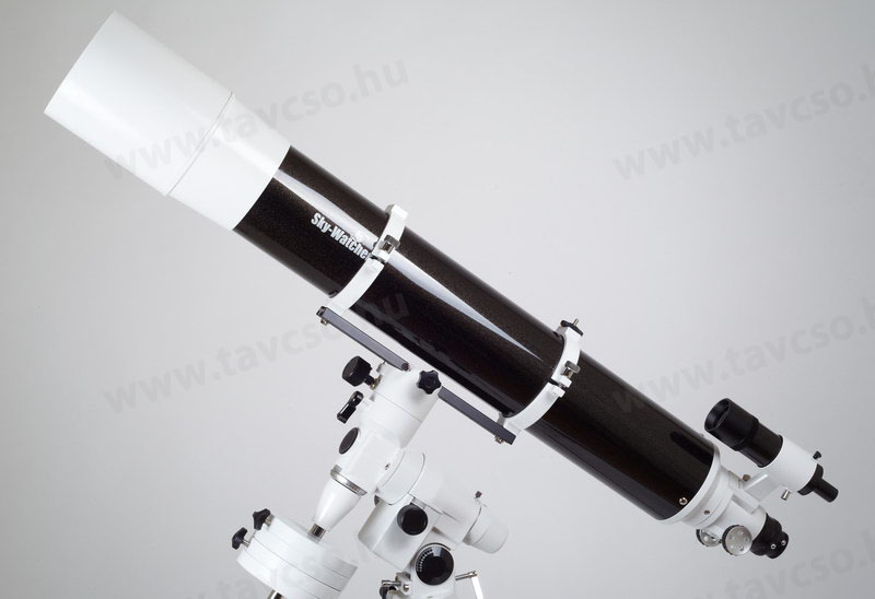 Tub refractor SkyWatcher Evostar-120 120/1000. Echipament: lunetă căutătoare 9×50, oglindă zenitală de 2″, oculare cu bariu de 25 mm (40x) și 10 mm (100x)
